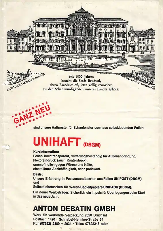 When DEBATIN extended its activities into the plastic film sector, with new products such as self-adhesive bags and document pouches for the Deutsche Bahn, we quickly earned ourselves a name as a specialist for packaging and plastic film – an evolution that we see reflected in the claims and brochures printed over the years.